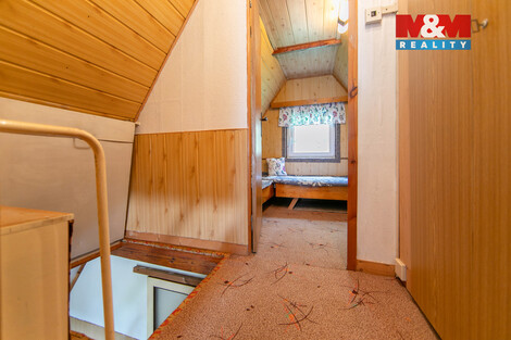 Prodej krásné chaty v Bukovci u Horšovského Týna v chatové osadě nedaleko rybníka Korida. Jedná se o dvoupodlažní dřevěnou chatu postavenou na zděném základu, ve kterém se nachází sklep a dílna. Podlahová plocha chaty je krásných 55 m2. V 1NP se nachází vstupní chodba, obývací pokoj, kuchyňský kout, koupelna s WC a velká terasa, v 2NP jsou pak dvě ložnice. Pozemek okolo chaty představuje krásných 413 m2 a disponuje množstvím stromů a keřů, které tak vytváří skvělé místo pro relax a odpočinek. Tento rozlehlý prostor je jako stvořený pro zahradničení, relaxaci nebo drobné hospodaření. Do chaty je přivedena elektřina a voda s vlastního vrtu. Vytápění zajišťují krbová kamna a ohřev vody je řešen průtokovým ohřívačem. Odpady jsou svedeny do septiku. Chata má nová plastová okna a je velmi udržovaná. Máte rádi klid a chcete být obklopeni přírodou? Pak nás neváhejte kontaktovat a domluvit si prohlídku.