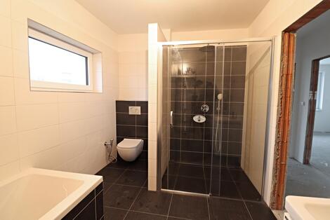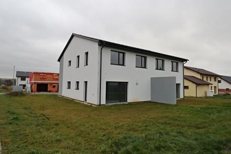 Nabízíme k prodeji polovinu dvojdomku v Horšovském Týně. Dům stojí v nově se rozvíjející čtvrti na okraji sídliště. Dům byl dokončen 6/2022. Každá bytová jednotka má samostatné měření el.proudu, plynu a podružné měření vody. Dům je vytápěn podlahovým vytápěním se samostatným kotlem na plyn. Dům se skládá z garáže, chodby, technické místnosti se sprchovým koutem, WC a dále z obývacího pokoje a budoucím kuchyňským koutem. V prostoru pod schodištěm se nachází spíž. V patře se nachází tři pokoje, ložnice se šatnou a koupelna s WC. Po vysouvacích schodech je přístupná půda domu. V domě je rozveden centrální vysavač. K domu náleží zahrada o výměře 290m2.