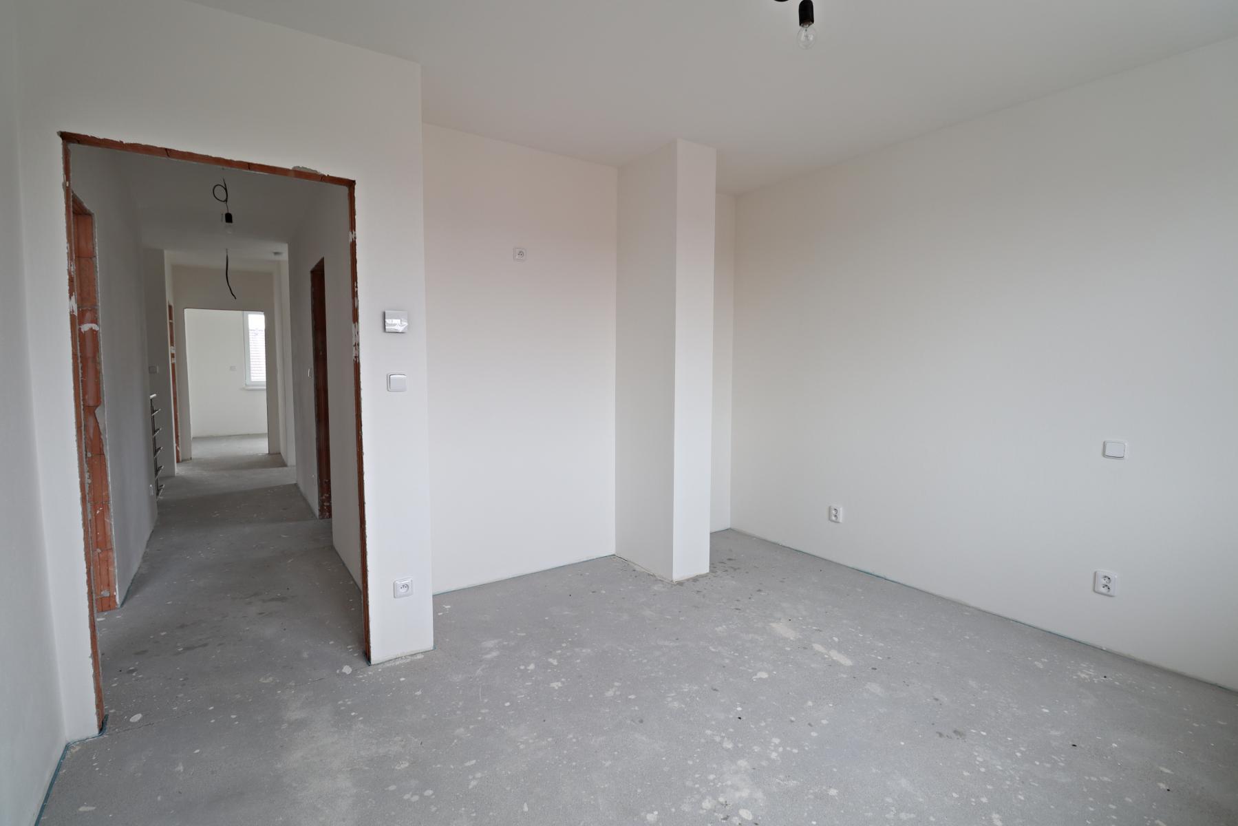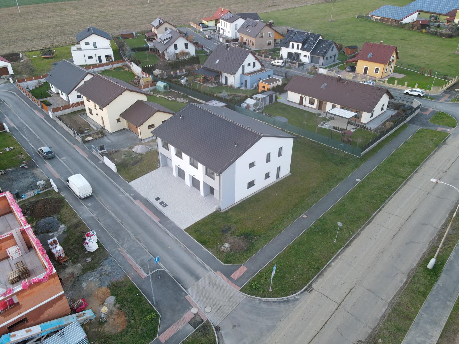 Nabízíme k prodeji polovinu dvojdomku v Horšovském Týně. Dům stojí v nově se rozvíjející čtvrti na okraji sídliště. Dům byl dokončen 6/2022. Každá bytová jednotka má samostatné měření el.proudu, plynu a podružné měření vody. Dům je vytápěn podlahovým vytápěním se samostatným kotlem na plyn. Dům se skládá z garáže, chodby, technické místnosti se sprchovým koutem, WC a dále z obývacího pokoje a budoucím kuchyňským koutem. V prostoru pod schodištěm se nachází spíž. V patře se nachází tři pokoje, ložnice se šatnou a koupelna s WC. Po vysouvacích schodech je přístupná půda domu. V domě je rozveden centrální vysavač. K domu náleží zahrada o výměře 290m2.